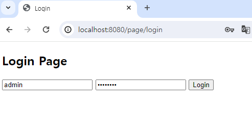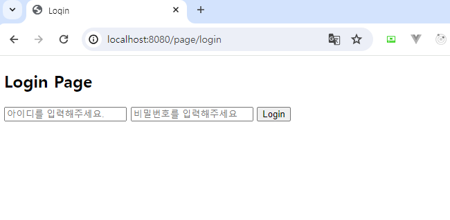 서버를 실행한 뒤 다음과 같이 /page/login에 접속해 보면 로그인 정보를 입력할 수 있는 화면을 확인할 수 있습니다.