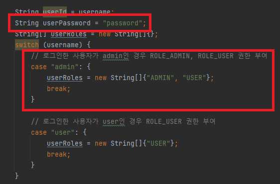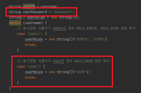 userDetailService에 작성해 둔 것을 확인해 보면 사용자 아이디가 "user"인 경우 ROLE_USER 권한을 설정하는 것을 볼 수 있습니다.