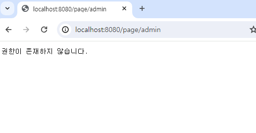 여기서 권한이 부여되어 있지 않은 /page/admin를 url에 강제 입력해 보겠습니다.