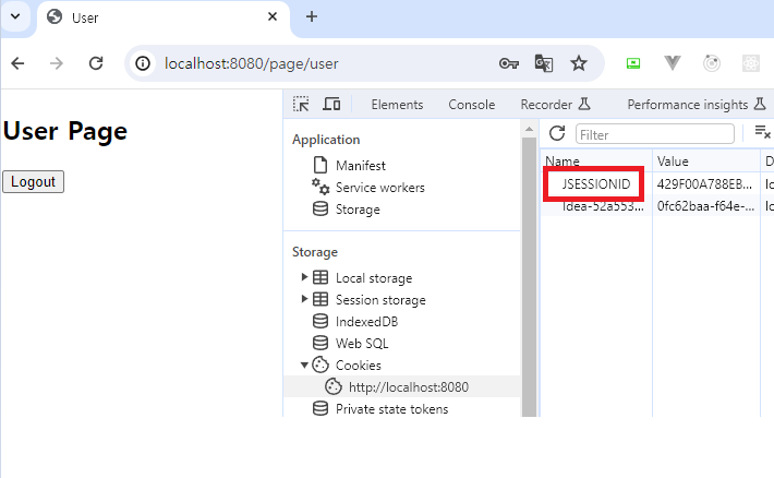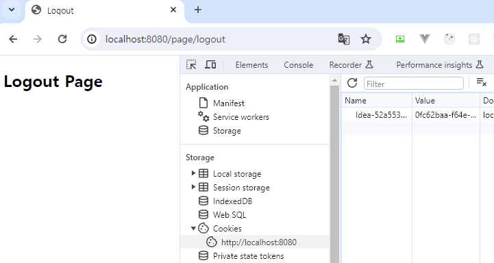 또한 로그인을 할 경우 다음과 같이 쿠키에서 확인할 수 있는 session ID도 로그아웃이 되면 설정한 대로 자동 삭제가 되는 것도 볼 수 있습니다.