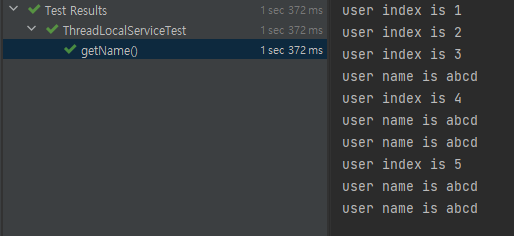코드를 확인해 보시면 3개의 thread가 동시에 비즈니스 로직을 처리하고, 매번 동작을 처리할 때 index 처리 후 사용자 이름을 매핑하여 thread local에 저장하는 것을 확인할 수 있습니다.