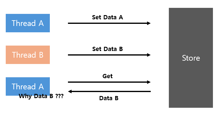 thread A 입장에서는 저장했던 데이터를 그대로 전달받아 내부 로직에 사용하고 싶었지만, 동시에 thread B의 데이터가 저장소에 저장되었기 때문에 thread A는 원하는 데이터를 확인할 수 없게 됩니다.
