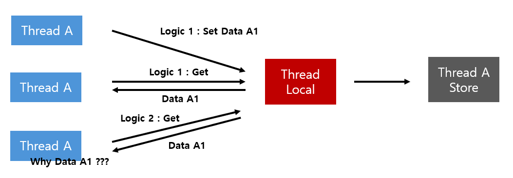 하지만 위의 코드 예시를 기준으로 발생될 수 있는 문제점은 5개의 비즈니스 로직을 3개의 thread가 처리를 수행할 때 1개의 로직 처리를 완료한 thread가 다음 로직을 처리할 때 이전 처리를 위해 저장해 뒀던 정보가 저장소에 남아있다는 것입니다.