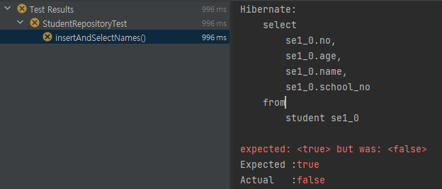 위와 같이 설정되어 있는 상황에서 StudentRepository에 정의되어 있는 메서드에 대한 단위 테스트를 작성하려고 하면 다음과 같이 작성할 수 있습니다.