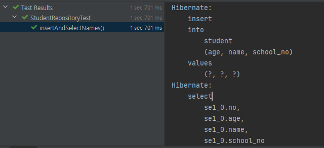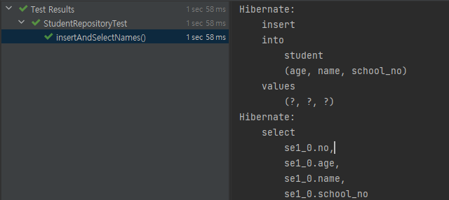 먼저 위의 설정처럼 메서드 parameter에 name값을 넣어 insert 동작이 이루어지도록 해두면 다음과 같이 테스트가 성공하는 것을 볼 수 있습니다.