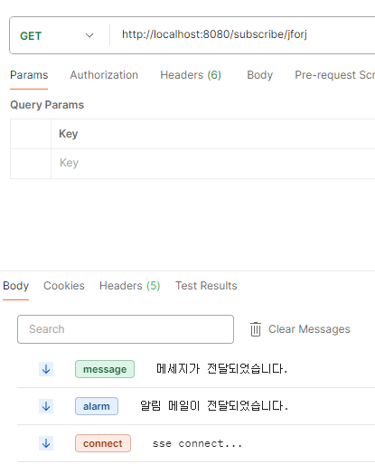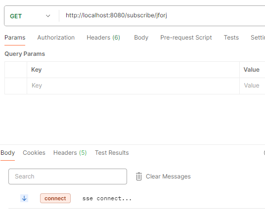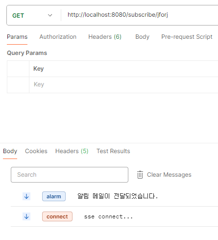 먼저 다음과 같이 subscribe API를 서버에 전달하여 id가 jforj인 sse emitter를 구독해 보겠습니다.