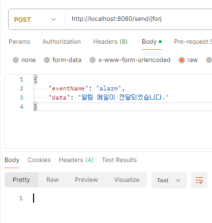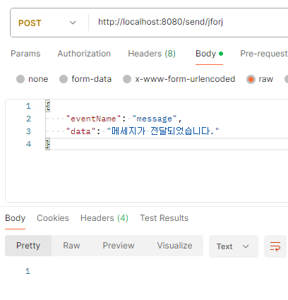 다음으로 send API를 서버에 전달하여 구독된 sse emitter를 보유하고 있는 client에 메시지를 전달해 보겠습니다.