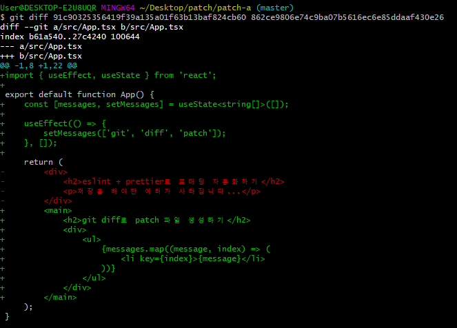 위에서 생성한 patch 파일 내용을 확인해 보면 다음과 같이 git diff의 결과가 그대로 담겨있습니다.
