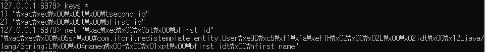 JdkSerializationRedisSerializer를 사용하면 객체를 바이트 스트림 형태로 변환하여 redis에 저장되며 저장된 key, value를 확인하면 바이트 스트림 형태로 변경된 결과물과 package 구조 및 객체 명 등을 확인할 수 있습니다.