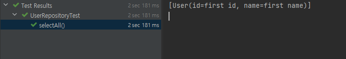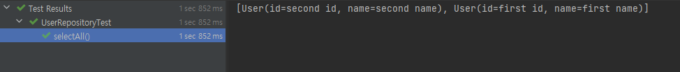 user entity의 이름을 User에서 MyUser라고 변경한 뒤 selectAll test를 수행하면 다음과 같은 결과를 확인할 수 있습니다.