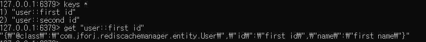 그리고 데이터를 생성하는 테스트 코드를 다시 실행해 보면 다음과 같이 redis에 저장되는 것을 볼 수 있습니다.