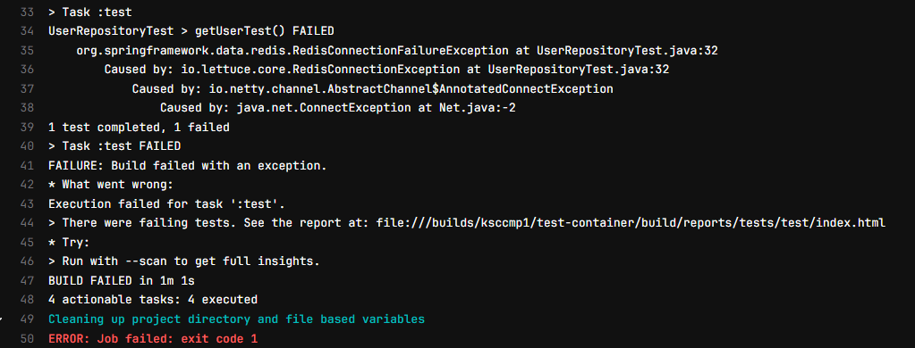 그런 뒤 test container를 사용하지 않는 환경으로 설정하고 연결되어 있는 gitlab repository에 push를 하면 파이프라인이 동작되지만 gitlab에서 redis 서버에 연결될 수 없기 때문에 파이프라인 동작이 실패하는 것을 볼 수 있습니다.