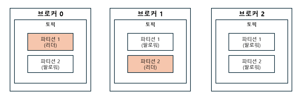 이들 중 1개의 파티션에 대해서만 리더 파티션으로 설정되고 나머지는 팔로워 파티션으로 설정이 됩니다.