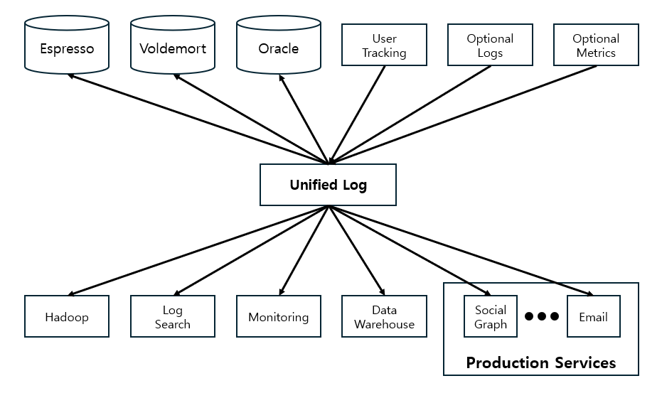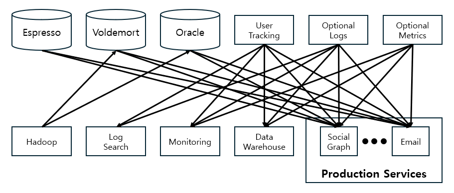 이런 아키텍처를 사용되고 있는 상황에서 링크드인은 신규 시스템을 만들기로 결정했고 그에 따른 결과물이 kafka가 되었습니다.