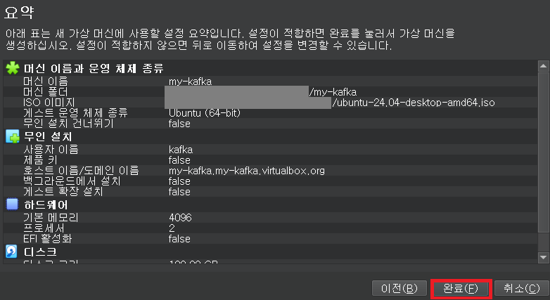 모든 설정이 올바르게 되었는지 요약 본을 확인한 뒤 완료를 클릭합니다.