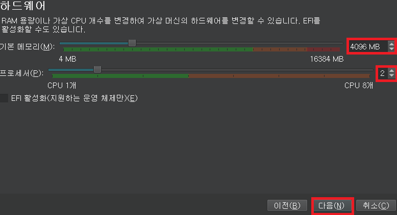 그래서 다음과 같이 메모리와 프로세서 설정을 할 예정이고 필요하신 경우 더 높은 스펙을 설정하시면 됩니다.