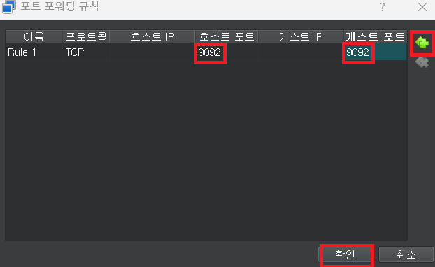 오른쪽에 + 버튼을 클릭한 뒤 호스트와 게스트 포트에 모두 9092를 입력한 rule을 추가하고 확인을 클릭합니다.