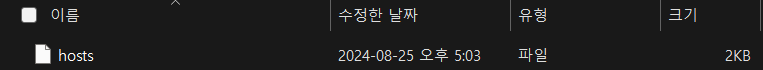 window 기준으로 "C:\Windows\System32\drivers\etc" 경로로 이동하면 hosts 파일이 다음과 같이 존재합니다.