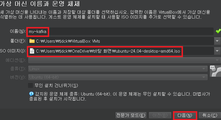 이름은 자유롭게 입력하고 iso 이미지는 위에서 설치한 ubuntu iso 이미지를 선택하고 다음을 눌러줍니다.