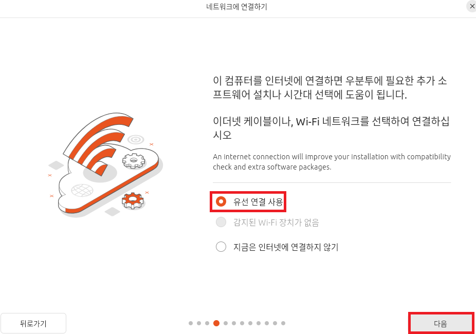 네트워크 설정 쪽은 "유선 연결 사용"을 선택하여 다음을 클릭합니다.