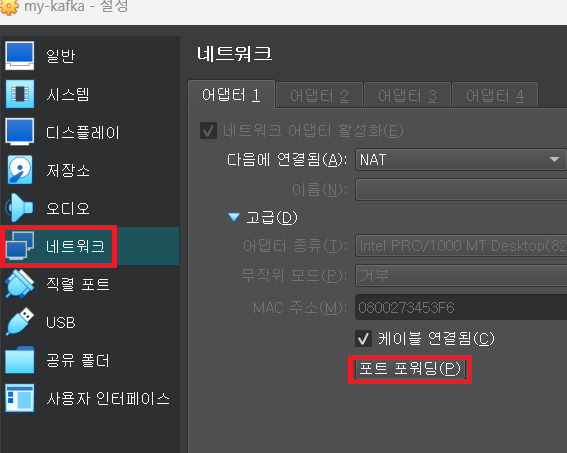 virtual box에서 kafka를 설치한 가상 머신을 선택한 뒤 "설정"을 클릭합니다.