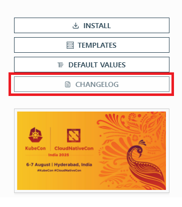 artifact hub에서 helm chart를 선택한 뒤 오른쪽을 보면 아래와 같이 changelog를 확인할 수 있는 버튼이 별도로 있지만 일반적으로 활성화가 되어 있지는 않습니다.