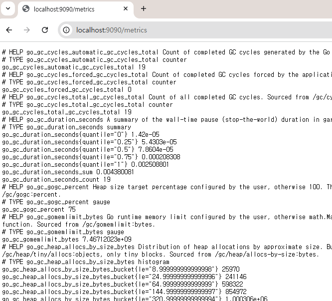 또한 경로를 /query 대신 /metrics라고 입력하여 접속하면 다음과 같이 prometheus에 수집되어 있는 metric에 대한 정보도 모두 확인을 해볼 수 있습니다.
