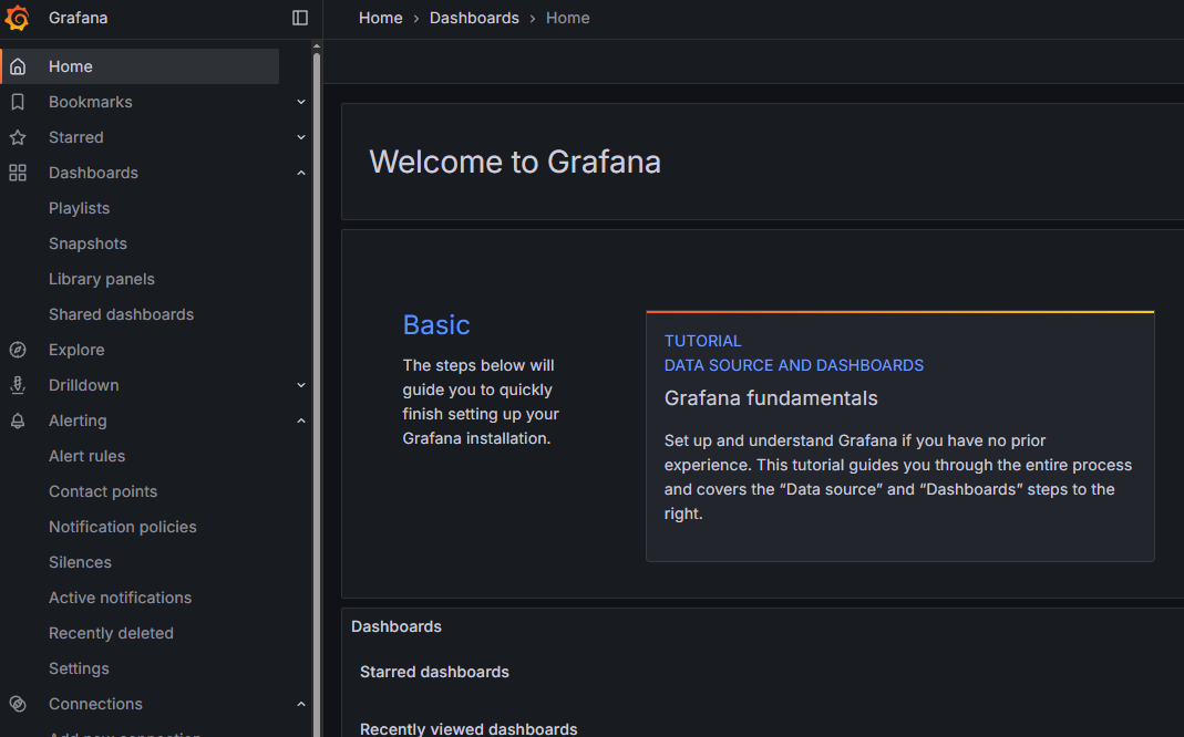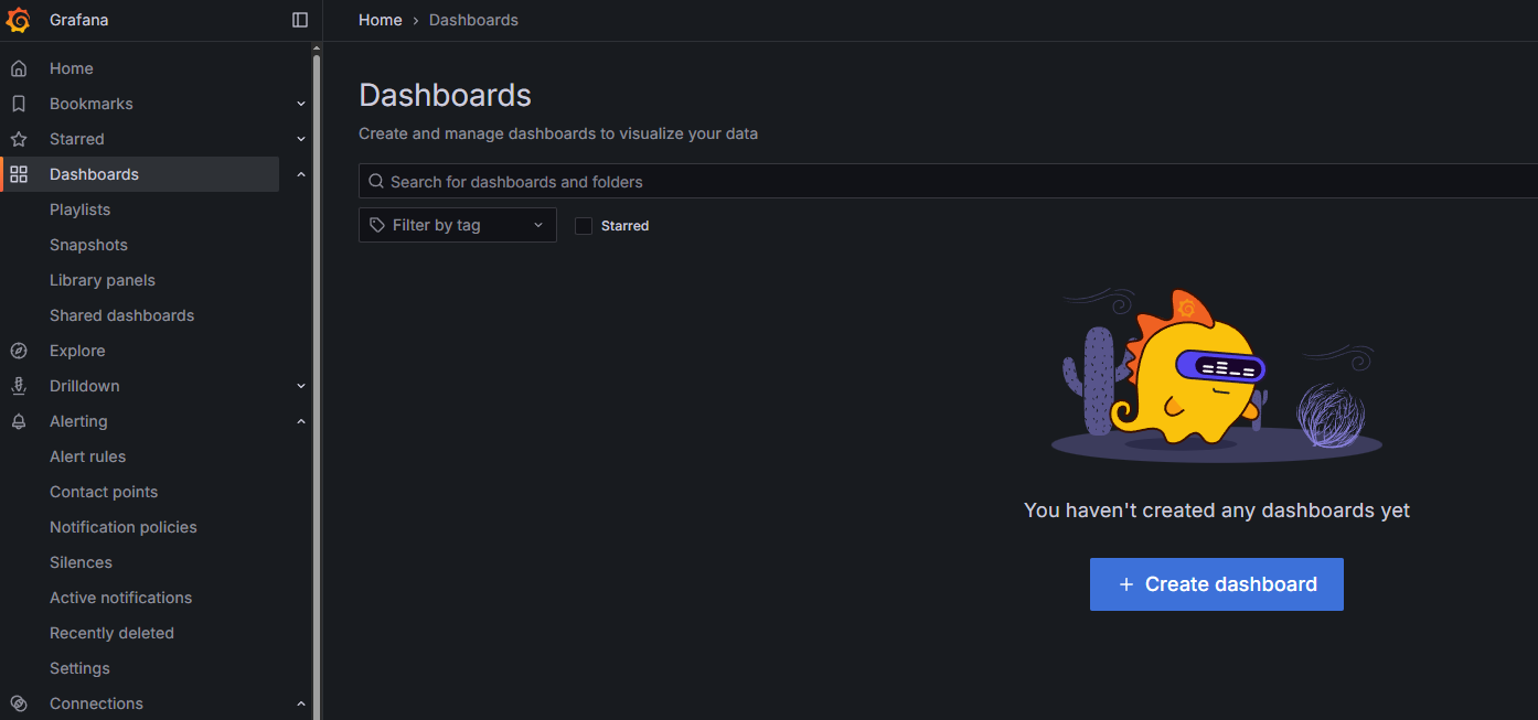 동일하게 네비게이션 바에서 Dashboards 메뉴를 클릭하면 grafana에서 시각적으로 확인할 수 있는 대시보드를 구성할 수 있습니다.