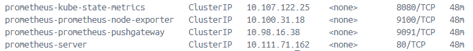 먼저, 명령어를 이용하여 설치된 svc를 확인하면 다음과 같이 prometheus-server라는 이름의 svc가 존재할 겁니다.