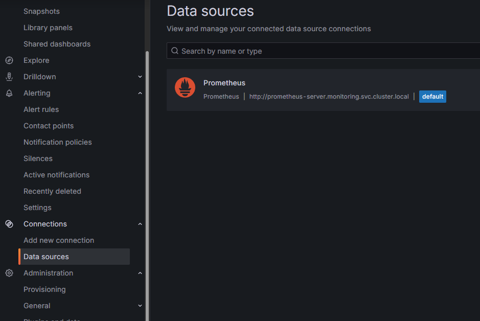 내비게이션 바에서 Data sources 메뉴를 클릭하면 grafana를 설치할 때 설정했던 prometheus 정보가 담겨 있는 것을 확인할 수 있습니다.