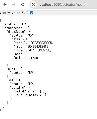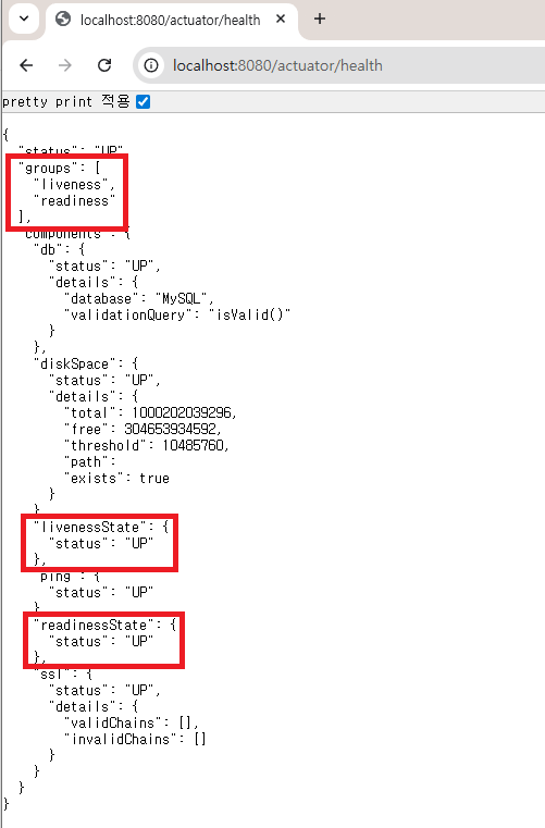 그 뒤 다시 health endpoint에 접속해 보면 다음과 같이 probe 값들이 추가된 것을 확인할 수 있습니다.