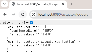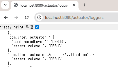 com.jforj.actuator: debug # com.jforj.actuator 패키지 하위는 모두 debug level