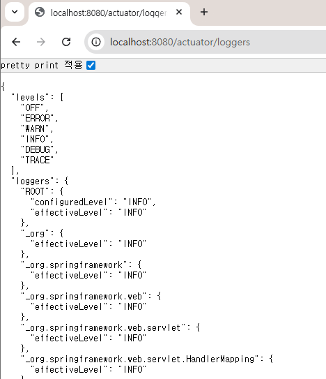 이런 상황에서 actuator 사용이 올바르게 되고 있다면 손쉽게 로깅 레벨을 변경할 수 있습니다.