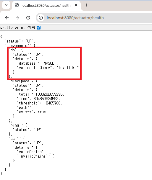 그 뒤 다시 health endpoint를 접속해보면 다음과 같이 db에 대한 정보도 추가된 것을 확인할 수 있습니다.