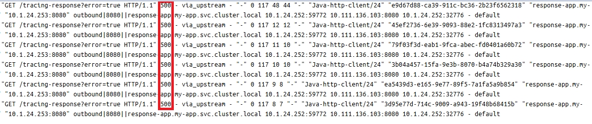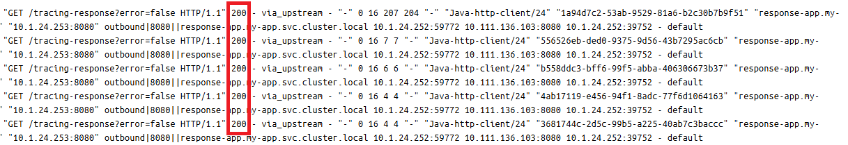 이곳에 envoy sidecar에 다음과 같이 500 에러가 아닌 요청들이 이루어지더라도 otel-collector의 로그에서 확인이 되지 않는 것을 볼 수 있습니다.