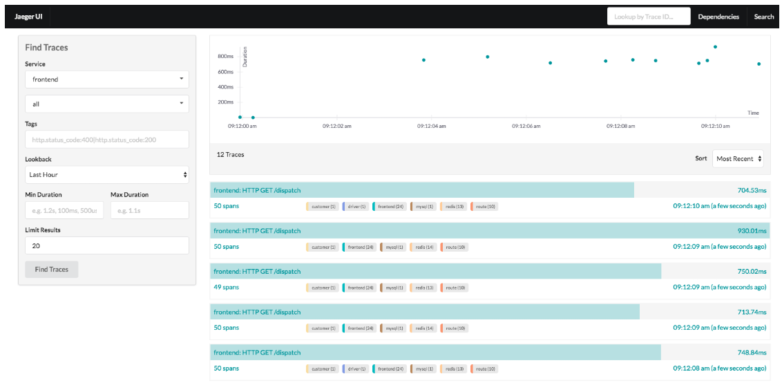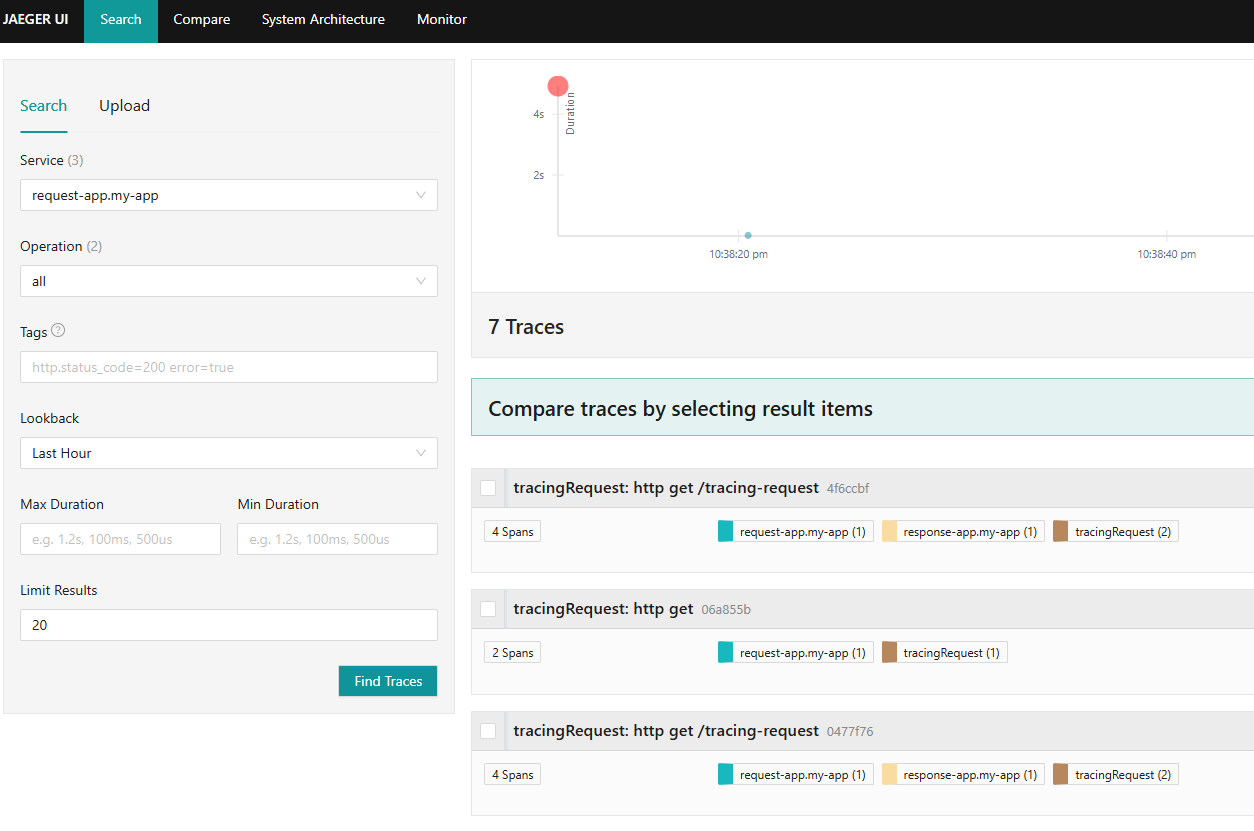 jaeger를 구축하게 되면 GUI 기반의 서비스를 활용하여 요청 처리에 대한 분석이 가능하게 됩니다.