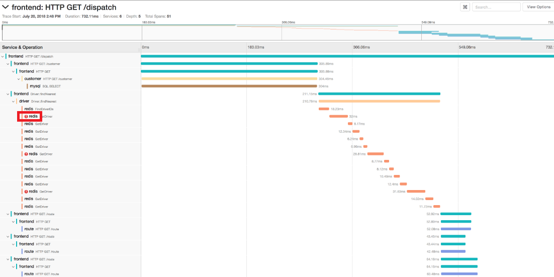 상세 정보를 보게 된다면 아래와 같이 각 서비스 별로 비즈니스 처리가 이루어진 순서와 소요 시간, 장애가 발생했을 땐 왼쪽 부분의 느낌표로 처리된 부분을 한눈에 확인하여 어떤 흐름으로 요청이 처리되었는지 확인할 수 있게 됩니다.