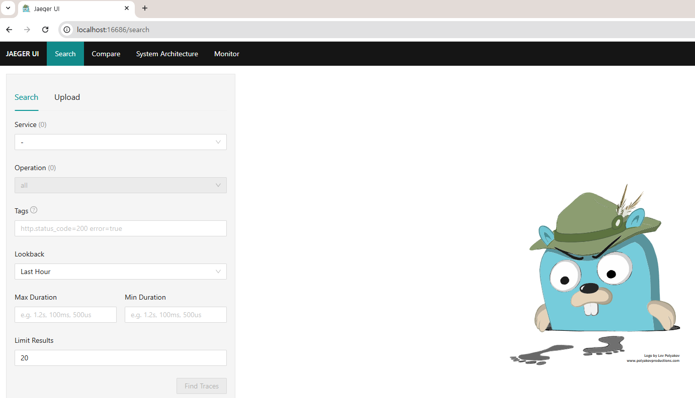 그리고 다음과 같이 url을 입력해 보면 jaeger GUI를 확인할 수 있습니다.