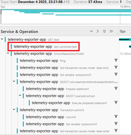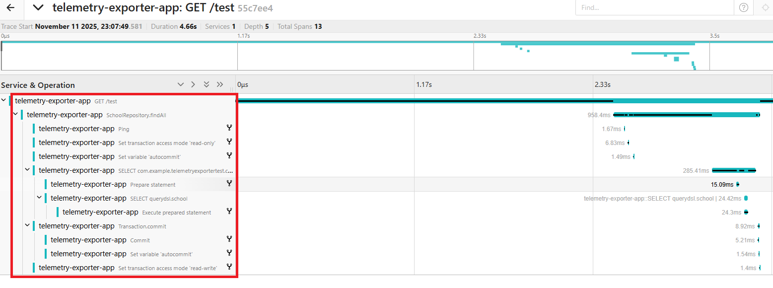 java agent가 올바르게 주입이 이루어졌다면 클래스 실행 시점에 요청을 가로챈 뒤 자동으로 telemetry 정보가 수집되어 micrometer 기반으로 수집하는 것보다 더 많은 span 정보를 확인할 수 있게 됩니다.