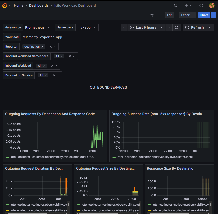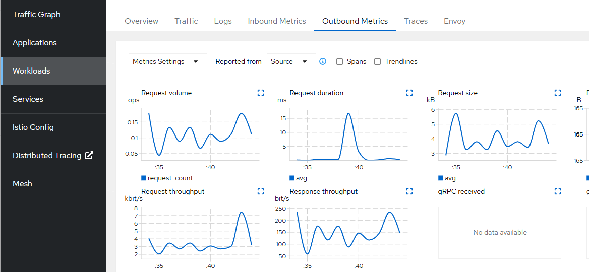 대표적으로 "Workloads > application 선택 > Outbound Metrics"에 접속해 보면 metric을 이용하여 요청/응답에 대한 그래프를 확인할 수 있습니다.