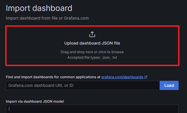 3. JSON 파일 업로드하는 곳에 dashboard 링크 클릭하여 다운로드한 json 파일들을 모두 업로드