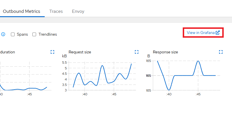 위에서 prometehus 검증을 위해 확인한 Outbound Metrics의 오른쪽을 보면 다음과 같이 grafana로 이동되는 링크가 표기됩니다.