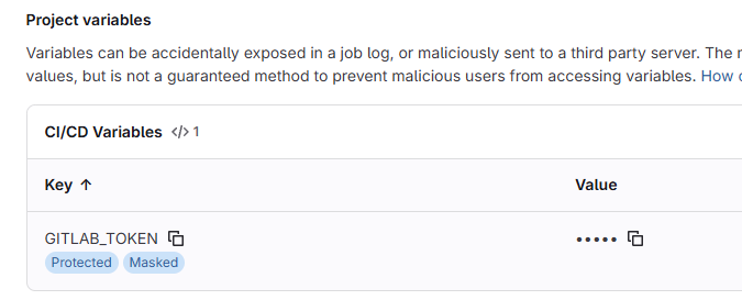 key 값은 "GITLAB_TOKEN" 으로 해줘야 하며 value에는 복사한 token 값을 넣어주면 됩니다.