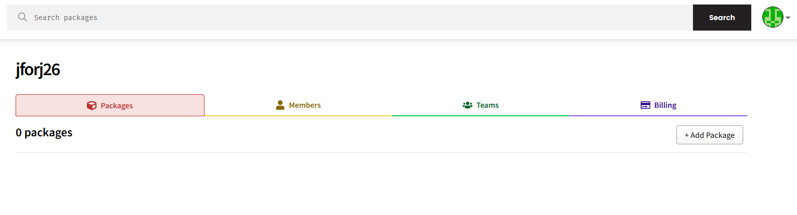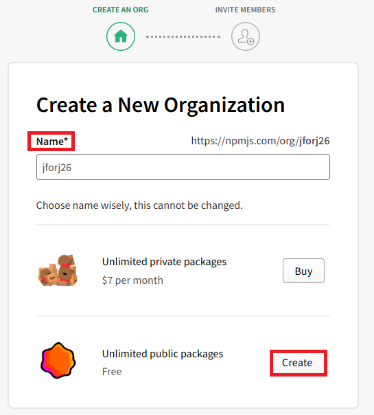 저의 경우 위에 package.json에 작성할 때 @jforj26과 같은 prefix를 패키지 명에 구성했는데, @을 제외한 정보가 organization의 정보로 사용되어야 합니다.