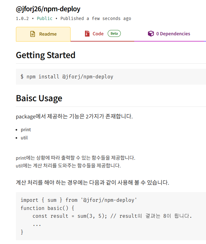 README.md의 경우 npm에 배포된 패키지의 상세 정보에 노출시켜 패키지에 대한 설명을 담을 수 있습니다.