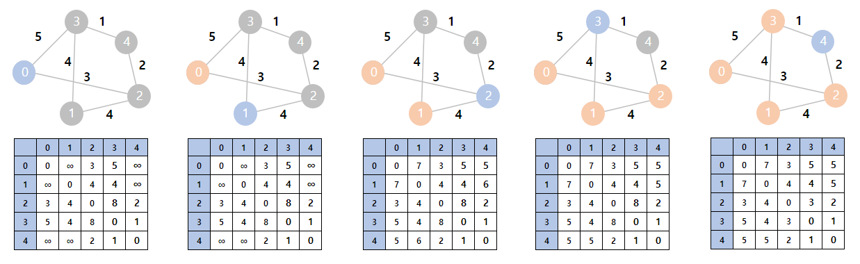 파란색으로 표현된 노드는 중간 지점으로 선택된 노드이며 표의 값들은 중간 노드를 거쳐서 가는 것과 기존의 거리의 최솟값들을 표현한 것입니다.