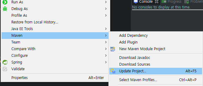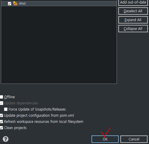 [ 6. mvc라는 이름으로 생성된 프로젝트를 우클릭하여 maven update 진행 (pom.xml 변경이 일어나면 항상 해줘야함) ]