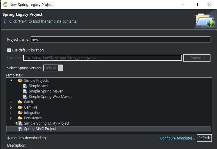 [ 2. Project name은 mvc 입력, Templates은 Spring MVC Project 선택 후 Next ]