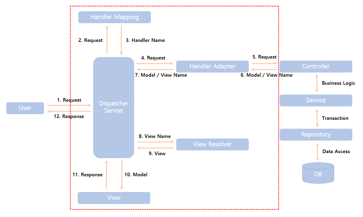 이번 포스팅에서는 위의 MVC구조에서 빨간 박스에 포함된 내용에 대해 적어보고자 합니다.