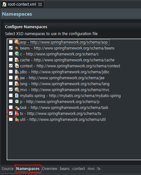 [ 2. root-context.xml의 Namespaces에서 tx 체크 ]